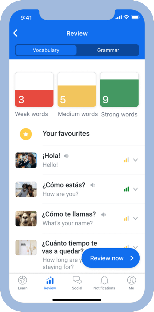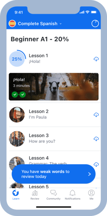 Start with short, bite-size lessons at your own pace to learn grammar and vocabulary so that you can have more speaking time in live classes.