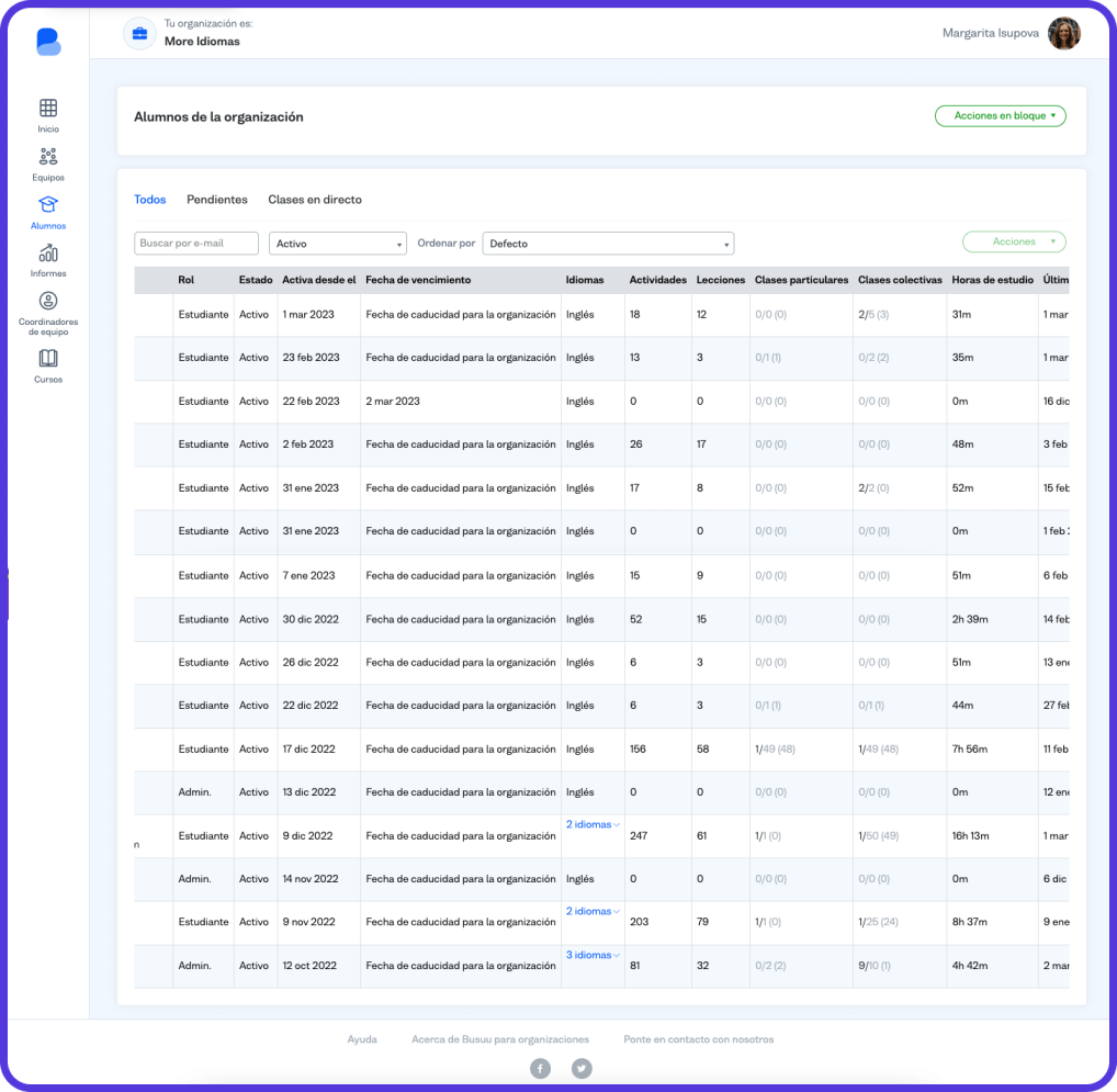 By allocating live lessons and sharing metrics, a manager can support active learners and assist the ones who fall behind